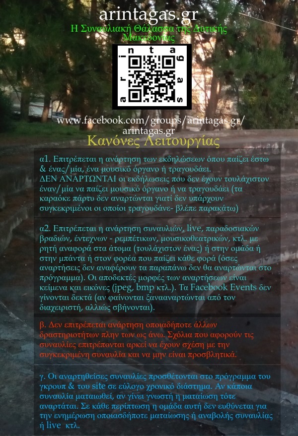 Το arintagas.gr είναι μια εθελοντική πρωτοβουλία συγκέντρωσης και ανάρτησης συναυλιών, live, μουσικών βραδιών κ.α. που συμβαίνουν στην Δυτική Μακεδονία, με σκοπό την ενημέρωση των πολιτών αλλά κυρίως την προτροπή για παρακολούθηση συναυλιών και απαγγίστρωση από την τηλεόραση, τον τζόγο, τις ουσίες και άλλες κακές επιρροές. Ακολουθούν οι κανόνες ανάρτησης στην σελίδα του Facebook ‘arintagas.gr – Συναυλιακή θάλασσα της Δυτ. Μακεδονίας’ – https://www.facebook.com/groups/arintagas.gr