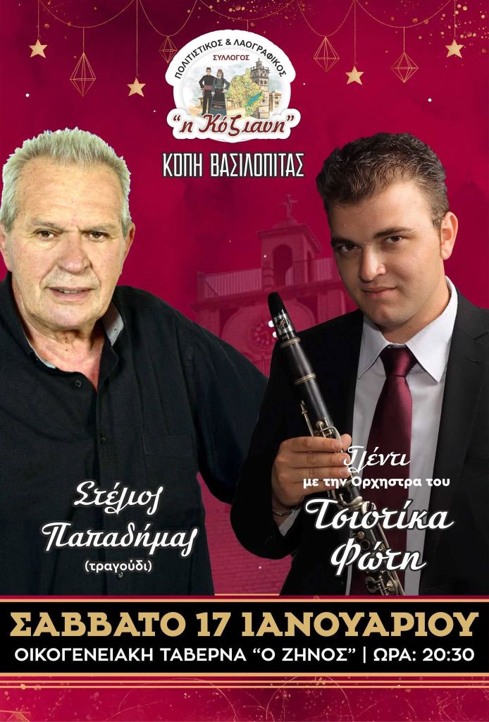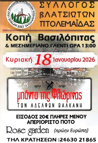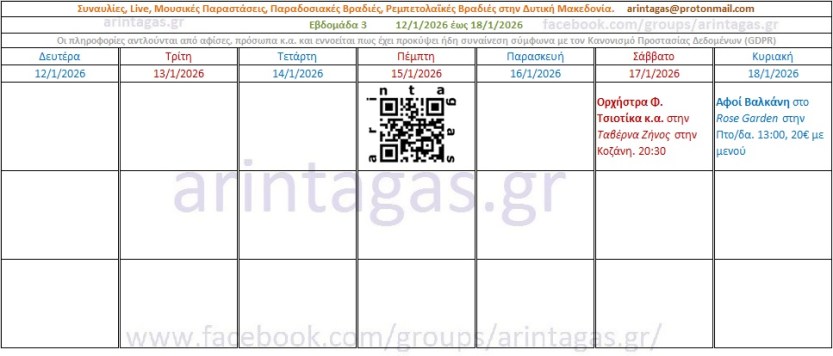 Ορχήστρα Φ. Τσιοτίκα κ.α. στην Ταβέρνα Ζήνος στην Κοζάνη. Σάββατο 17/1/26. 20:30Αφοί Βαλκάνη στο Rose Garden στην Πτο/δα. Κυριακή 18/1/26, 13:00, 20€ με μενού
