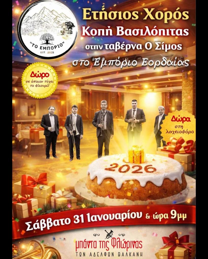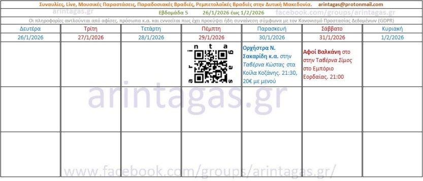 Ορχήστρα Ν. Σακαρίδη κ.α. στην Ταβέρνα Κώστας στα Κοίλα Κοζάνης. Παρασκευή 30/1/26, 21:30, 20€ με μενούAφοί Βαλκάνη στο στην Ταβέρνα Σίμος στο Εμπόριο Εορδαίας. Σάββατο 31/1/26, 21:00