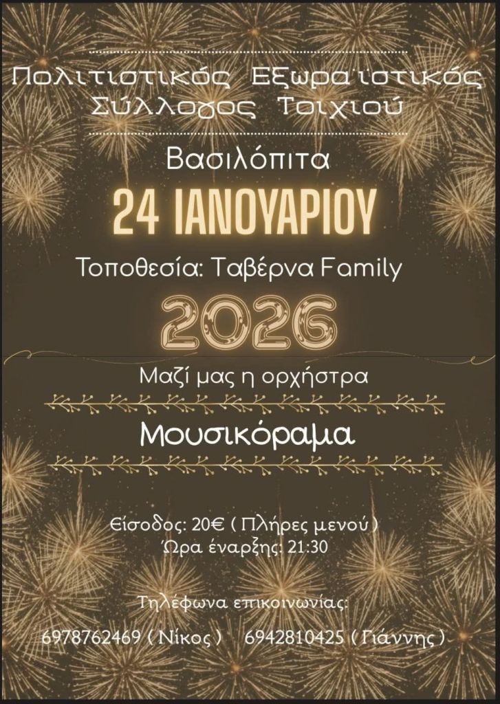 Iakovos Moisiadis Quintet στο Πνευματικό Κέντρο στην Πτο/δα. Δευτέρα 19/1/26, 21:00, 10€Ηidden In The Basement, Εdouarth στο 101 Rock Bar στον Κρόκο Κοζάνης. Σάββατο 24/1/26. 20:00, 10€Μελορυθμοί κ.α. στο Event Plaza στα Πετρανά Κοζάνης. Σάββατο 24/1/26. 21:00, 20€ με μενούΜ. Κόμπος κ.α. στο Στέκι Μας στην Κοζάνη. Σάββατο 24/1/26. 21:00Μουσικόραμα στο Family στην Χλόη Καστοριάς. Σάββατο 24/1/26. 21:30, 20€ με μενούΓ. Γρίβας κ.α. στο Garden Hall στον Κρόκο Κοζάνης. Σάββατο 24/1/26. 21:00, 5€Climate Change – Χρήστος Ραφαηλίδης στην Αίθουσα Τεχνης στην Κοζάνη. Κυριακή 25/1/26. 20:00Γ. Γρίβας κ.α. στο Doufas στο 7ο Χλμ Κοζάνης – Πτο/δας. Κυριακή 25/1/26. 14:00, 20€ με μενού