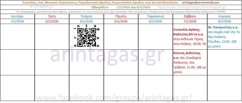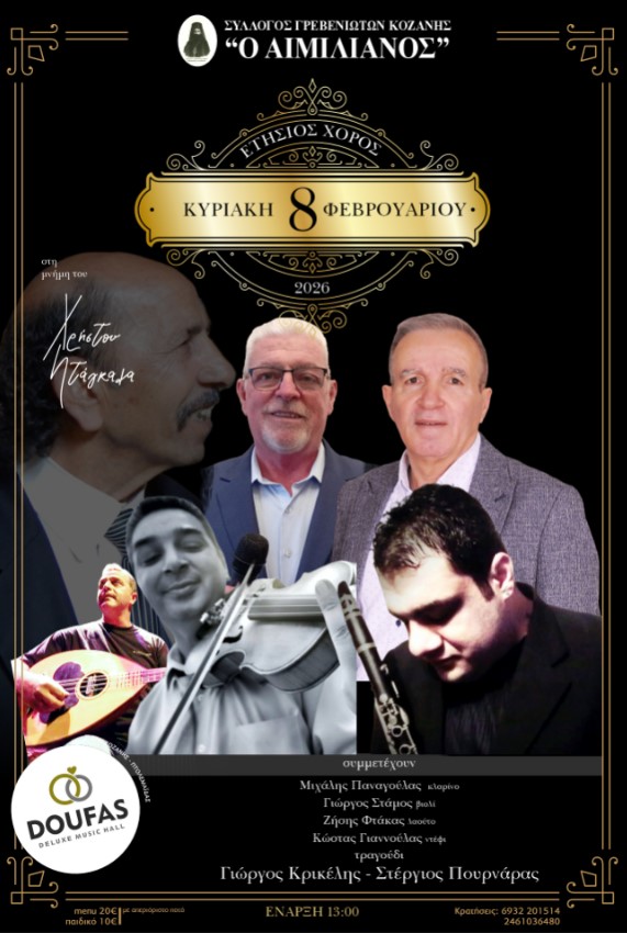 Συναυλία Αγάπης – Καλλιόπη Βέττα κ.α. στην Αίθουσα Τέχνης στην Κοζάνη. Σάββατο 7/2/2026, 18:00, 5€Κώστας Δεδούσης κ.α. στο Ξενοδοχείο Μηλιώνης στα Γρεβενά. Σάββατο 7/2/2026, 21:00, 18€ με μενούΜ. Παναγούλας κ.α. στο Doufas Hall στο 7ο Χλμ Κοζάνης – Πτο/δας. Kυριακή 8/2/26, 13:00, 20€ με μενού