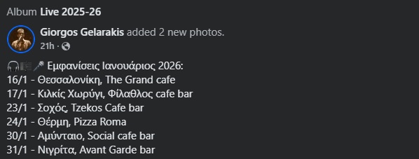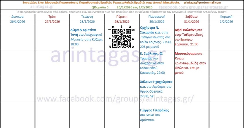 Δώρα & Χριστίνα Τανή στο Λαογραφικό Μουσείο στην Κοζάνη. Τετάρτη 28/1/25, 18:00Ορχήστρα Ν. Σακαρίδη κ.α. στην Ταβέρνα Κώστας στα Κοίλα Κοζάνης. Παρασκευή 30/1/26, 21:30, 20€ με μενούK. Σμόλικας, Φ. Τρασιάς στο Διαχρονικό στην Κολοκυνθού Καστοριάς. Παρασκευή 30/1/26, 22:00Χάλκινα Ηχοχρώματα κ.α. στο Ακρόαμα στο Άργος Ορεστικό. Παρασκευή 30/1/26, 22:30, 5€Γιώργος Γελαράκης στο Social στο Αμύνταιο. Παρασκευή 30/1/26Aφοί Βαλκάνη στο στην Ταβέρνα Σίμος στο Εμπόριο Εορδαίας. Σάββατο 31/1/26, 21:00Μουσικόραμα στο Κτήμα Τριανταφυλλίδη στην Φλώρινα. Σάββατο 31/1/26, 15€ με μενού