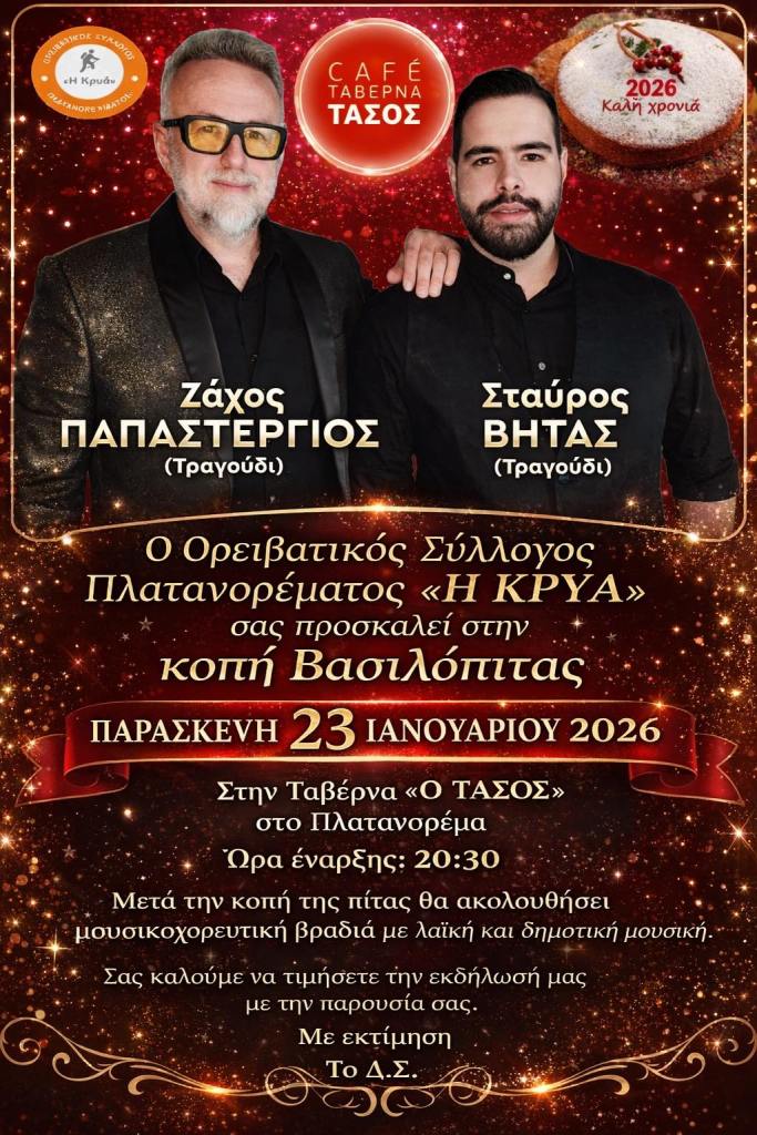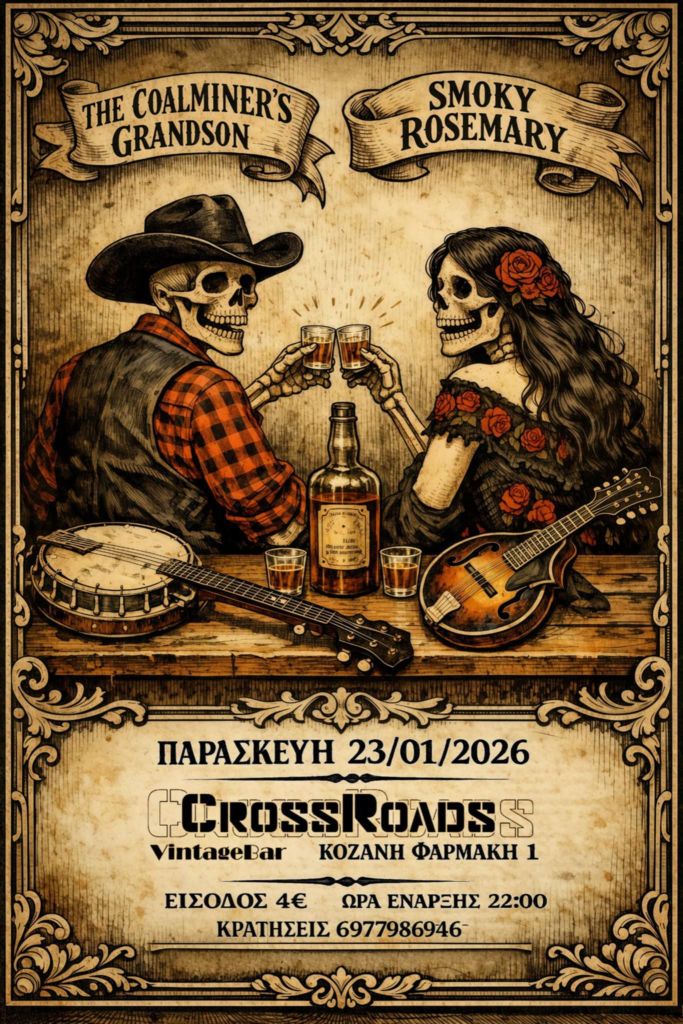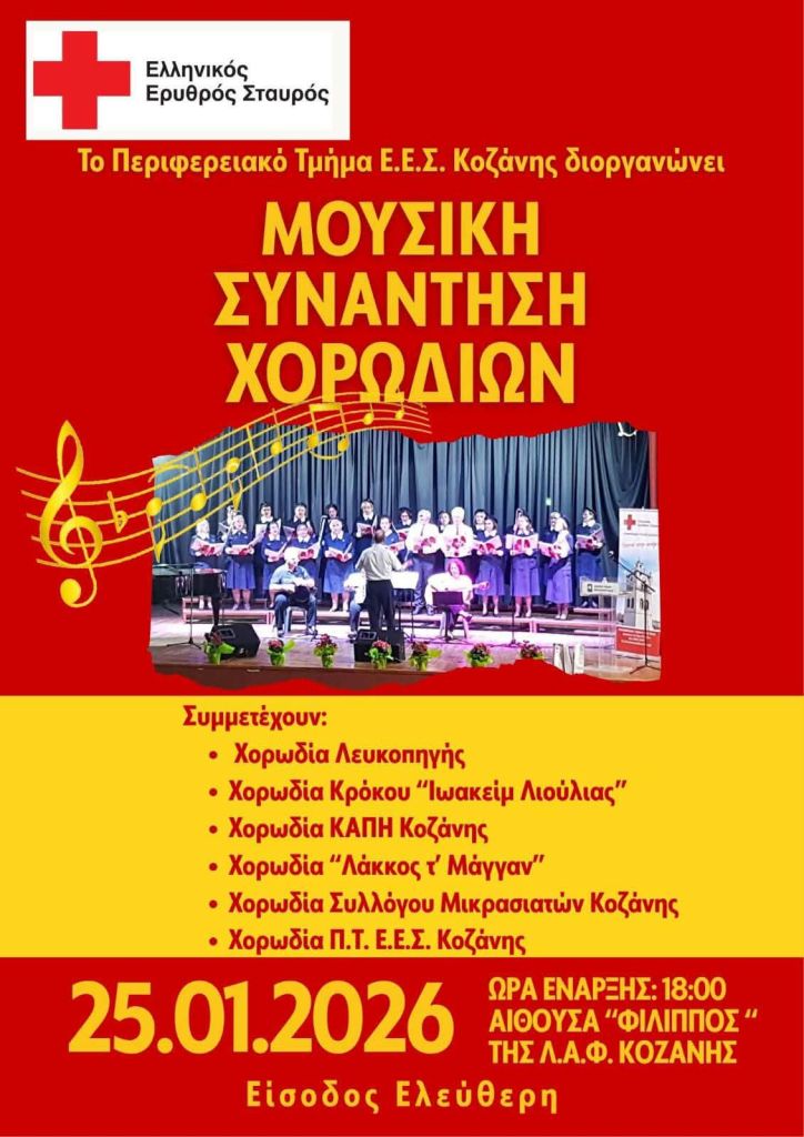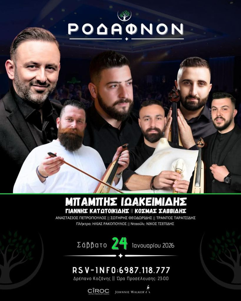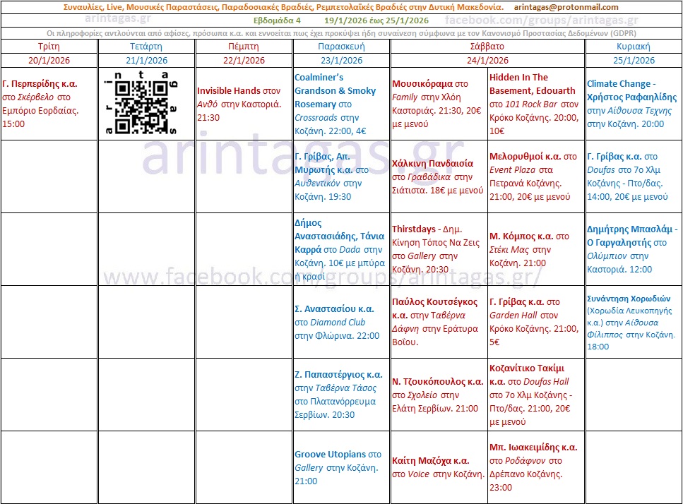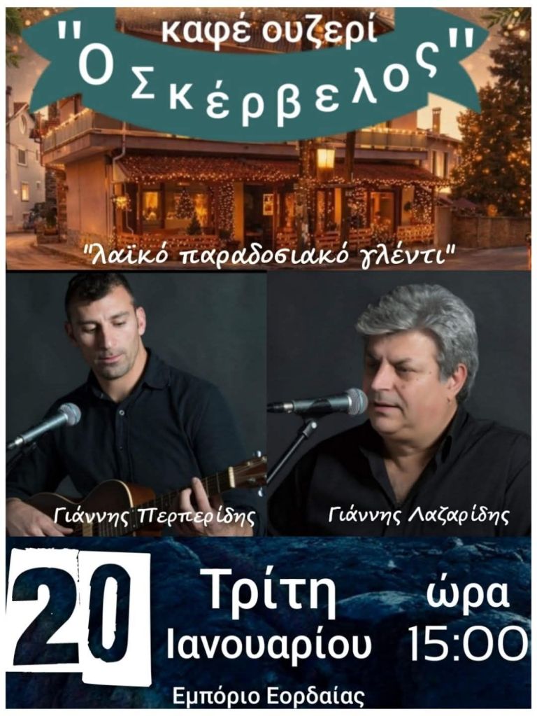 Γ. Περπερίδης κ.α. στο Σκέρβελο στο Εμπόριο Εορδαίας. Τρίτη 20/1/26, 15:00Invisible Hands στον Ανθό στην Καστοριά. Πέμπτη 22/1/26. 21:30Coalminer’s Grandson & Smoky Rosemary στο Crossroads στην Κοζάνη. Παρασκευή 23/1/26, 22:00, 4€Γ. Γρίβας, Απ. Μυρωτής κ.α. στο Αυθεντικόν στην Κοζάνη. Παρασκευή 23/1/26, 19:30Σ. Αναστασίου κ.α. στο Diamond Club στην Φλώρινα. Παρασκευή 23/1/26, 22:00Δήμος Αναστασιάδης, Τάνια Καρρά στο Dada στην Κοζάνη. Παρασκευή 23/1/26, 10€ με μπύρα ή κρασίGroove Utopians στο Gallery στην Κοζάνη. Παρασκευή 23/1/26, 21:00Ζ. Παπαστέργιος κ.α. στην Ταβέρνα Τάσος στο Πλατανόρρευμα Σερβίων. Παρασκευή 23/1/26, 20:30Ηidden In The Basement, Εdouarth στο 101 Rock Bar στον Κρόκο Κοζάνης. Σάββατο 24/1/26. 20:00, 10€Μελορυθμοί κ.α. στο Event Plaza στα Πετρανά Κοζάνης. Σάββατο 24/1/26. 21:00, 20€ με μενούΜ. Κόμπος κ.α. στο Στέκι Μας στην Κοζάνη. Σάββατο 24/1/26. 21:00Μουσικόραμα στο Family στην Χλόη Καστοριάς. Σάββατο 24/1/26. 21:30, 20€ με μενούΓ. Γρίβας κ.α. στο Garden Hall στον Κρόκο Κοζάνης. Σάββατο 24/1/26. 21:00, 5€Χάλκινη Πανδαισία στο Γραβάδικα στην Σιάτιστα. Σάββατο 24/1/26. 18€ με μενούThirstdays – Δημ. Κίνηση Τόπος Να Ζεις στο Gallery στην Κοζάνη. Σάββατο 24/1/26. 20:30Ν. Τζουκόπουλος κ.α. στο Σχολείο στην Ελάτη Σερβίων. Σάββατο 24/1/26. 21:00Παύλος Κουτσέγκος κ.α. στην Ταβέρνα Δάφνη στην Εράτυρα Βοΐου. Σάββατο 24/1/26.Κοζανίτικο Τακίμι κ.α. στο Doufas Hall στο 7ο Χλμ Κοζάνης – Πτο/δας. Σάββατο 24/1/26. 21:00, 20€ με μενούΜπ. Ιωακειμίδης κ.α. στο Ροδάφνον στο Δρέπανο Κοζάνης. Σάββατο 24/1/26. 23:00Climate Change – Χρήστος Ραφαηλίδης στην Αίθουσα Τεχνης στην Κοζάνη. Κυριακή 25/1/26. 20:00Γ. Γρίβας κ.α. στο Doufas στο 7ο Χλμ Κοζάνης – Πτο/δας. Κυριακή 25/1/26. 14:00, 20€ με μενούΔημήτρης Μπασλάμ – Ο Γαργαληστής στο Ολύμπιον στην Καστοριά. Κυριακή 25/1/26. 12:00Συνάντηση Χορωδιών (Χορωδία Λευκοπηγής κ.α.) στην Αίθουσα Φίλιππος στην Κοζάνη. Κυριακή 25/1/26. 18:00