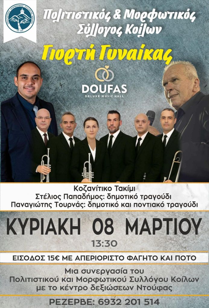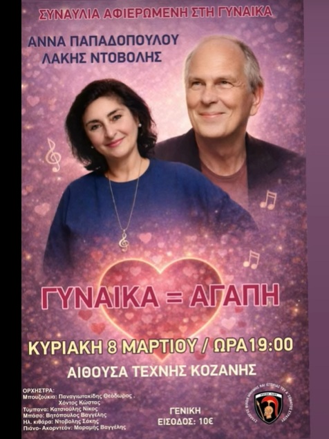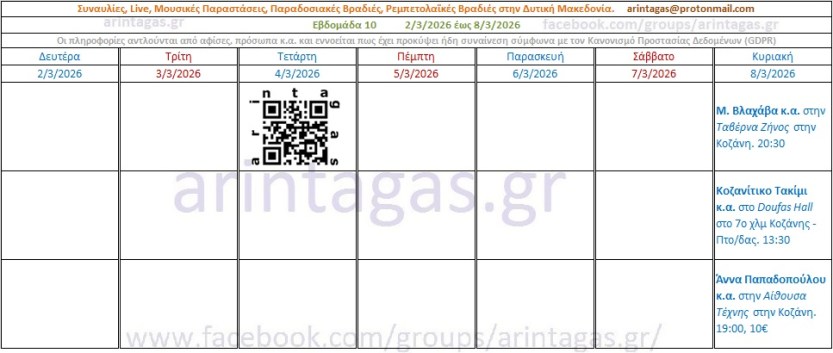Μ. Βλαχάβα κ.α. στην Ταβέρνα Ζήνος στην Κοζάνη. Κυριακή 8/3/26, 20:30Κοζανίτικο Τακίμι κ.α. στο Doufas Hall στο 7ο χλμ Κοζάνης – Πτο/δας. Κυριακή 8/3/26, 13:30Άννα Παπαδοπούλου κ.α. στην Αίθουσα Τέχνης στην Κοζάνη. Κυριακή 8/3/26, 19:00, 10€