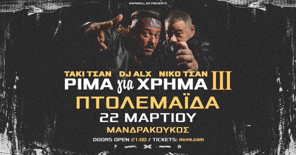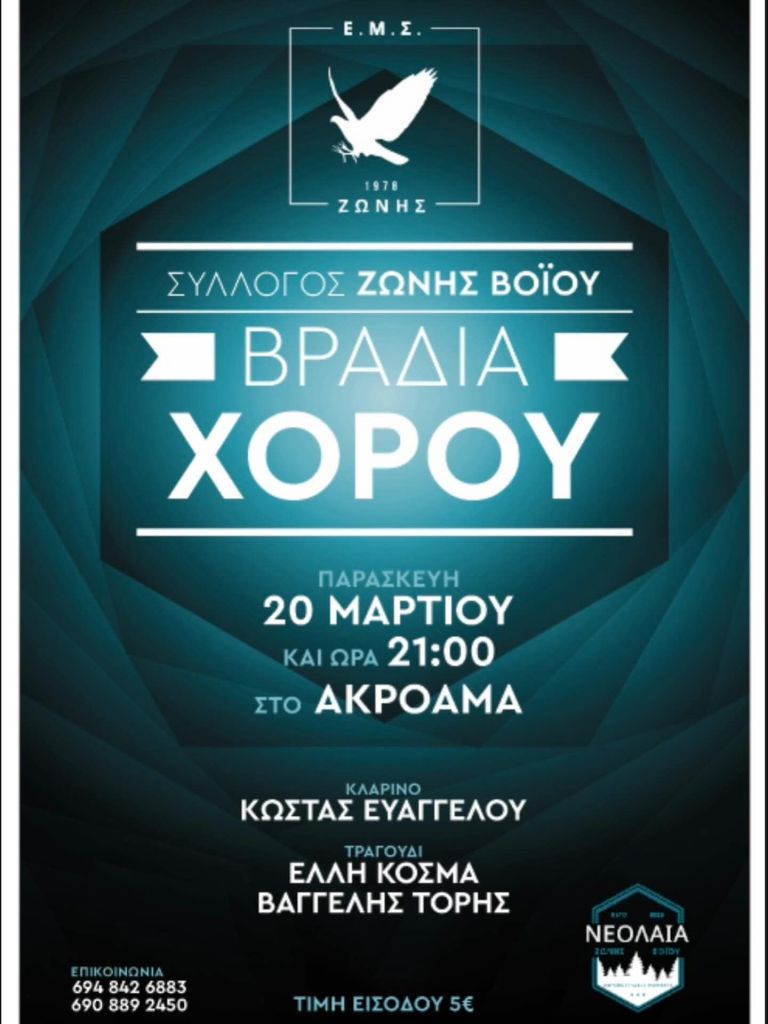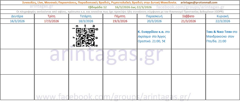 Κ. Ευαγγέλου κ.α. στο Ακρόαμα στο Άργος Ορεστικό. Παρασκευή 20/3/26, 21:00, 5€Τακι & Νικο Τσαν στο Mανδρακούκο στον Πτο/δα. Κυριακή 22/3/26, 21:00