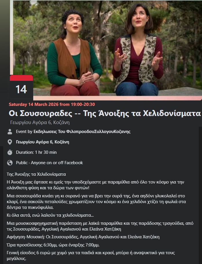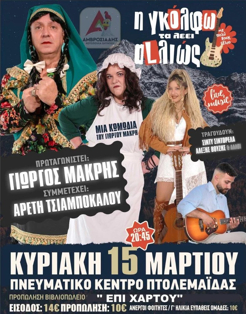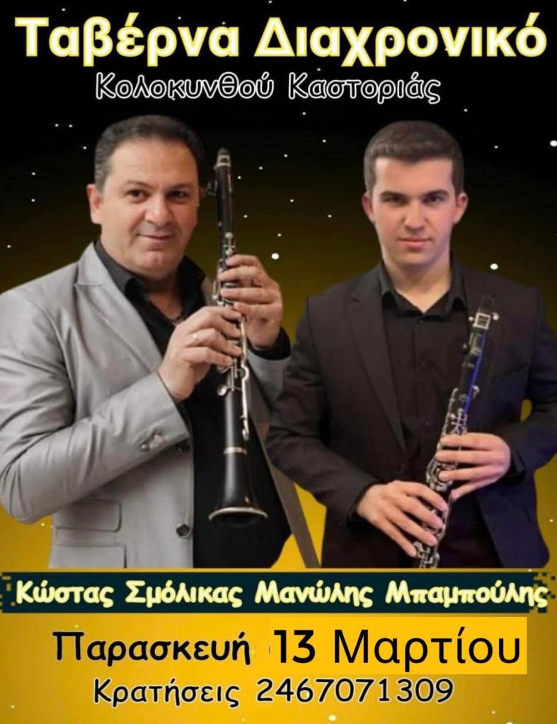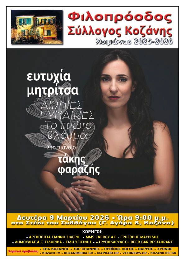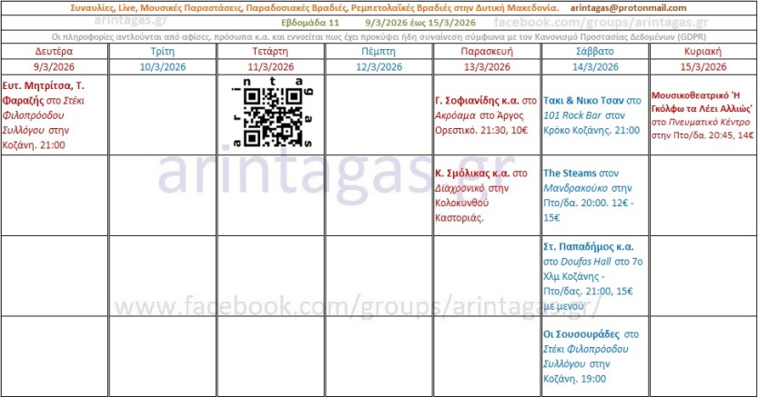 Ευτ. Μητρίτσα, Τ. Φαραζής στο Στέκι Φιλοπρόοδου Συλλόγου στην Κοζάνη. Δευτέρα 9/3/26, 21:00Γ. Σοφιανίδης κ.α. στο Ακρόαμα στο Άργος Ορεστικό. Παρασκευή 13/3/26, 21:30, 10€Κ. Σμόλικας κ.α. στο Διαχρονικό στην Κολοκυνθού Καστοριάς. Παρασκευή 13/3/26.Τακι & Νικο Τσαν στο 101 Rock Bar στον Κρόκο Κοζάνης. Σάββατο 14/3/26, 21:00The Steams στον Μανδρακούκο στην Πτο/δα. Σάββατο 14/3/26, 20:00 12€ – 15€Στ. Παπαδήμος κ.α. στο Doufas Hall στο 7ο Χλμ Κοζάνης – Πτο/δας. Σάββατο 14/3/26, 21:00, 15€ με μενούΟι Σουσουράδες στο Στέκι Φιλοπρόοδου Συλλόγου στην Κοζάνη. Σάββατο 14/3/26, 19:00Μουσικοθεατρικό ‘Η Γκόλφω τα Λέει Αλλιώς’ στο Πνευματικό Κέντρο στην Πτο/δα. Κυριακή 15/3/26, 20:45, 14€