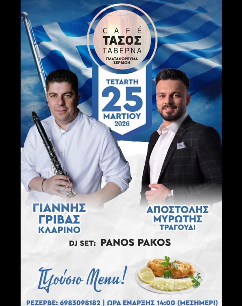 Π. Ντίμτσιος στον Πεντάλοφο Βοϊου. Τετάρτη 25/3/26.Γ. Γρίβας κ.α. στο Café Τάσος στο Πλατανόρρευμα Σερβίων. Τετάρτη 25/3/26. 14:00Κοινοί Θνητοί στο Scarabeo στην Πτο/δα. Πέμπτη 26/3/26, 21:00, 12€ – 15€Κοινοί Θνητοί στο Folk Café στην Σιάτιστα. Σάββατο 28/3/26, 21:00, 12€ – 15€Νο Freno, Thirstdays στο 101 Bar στον Κρόκο Κοζάνης. Σάββατο 28/3/26, 20:00, 10€ με ποτό