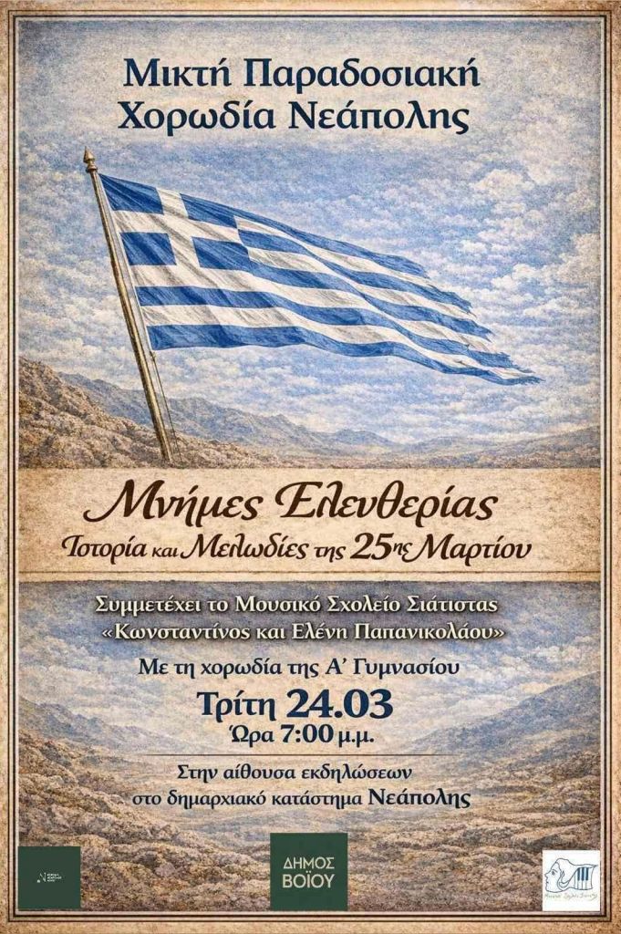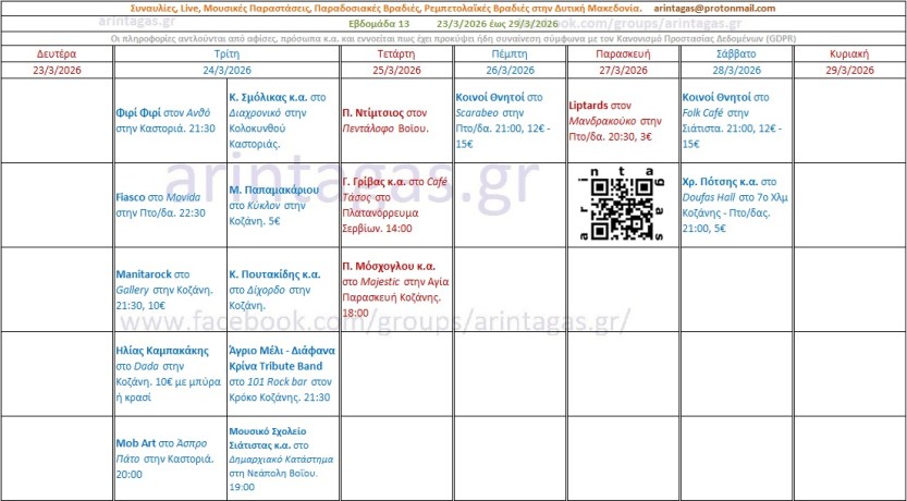 Κ. Σμόλικας κ.α. στο Διαχρονικό στην Κολοκυνθού Καστοριάς. Τρίτη 24/3/26.Μ. Παπαμακάριου στο Κύκλον στην Κοζάνη. Τρίτη 24/3/26. 5€Κ. Πουτακίδης κ.α. στο Δίχορδο στην Κοζάνη. Τρίτη 24/3/26. Άγριο Μέλι – Διάφανα Κρίνα Tribute Band στο 101 Rock bar στον Κρόκο Κοζάνης. Τρίτη 24/3/26. 21:30Φιρί Φιρί στον Ανθό στην Καστοριά. Τρίτη 24/3/26. 21:30Fiasco στο Movida στην Πτο/δα. Τρίτη 24/3/26. 22:30Manitarock στο Gallery στην Κοζάνη. Τρίτη 24/3/26. 21:30, 10€Ηλίας Καμπακάκης στο Dada στην Κοζάνη. Τρίτη 24/3/26. 10€ με μπύρα ή κρασίMob Art στο Άσπρο Πάτο στην Καστοριά. Τρίτη 24/3/26. 20:00Μουσικό Σχολείο Σιάτιστας κ.α. στο Δημαρχιακό Κατάστημα στη Νεάπολη Βοΐου. Τρίτη 24/3/26. 19:00Π. Ντίμτσιος στον Πεντάλοφο Βοϊου. Τετάρτη 25/3/26.Γ. Γρίβας κ.α. στο Café Τάσος στο Πλατανόρρευμα Σερβίων. Τετάρτη 25/3/26. 14:00Π. Μόσχογλου κ.α. στο Majestic στην Αγία Παρασκευή Κοζάνης. Τετάρτη 25/3/26, 18:00Κοινοί Θνητοί στο Scarabeo στην Πτο/δα. Πέμπτη 26/3/26, 21:00, 12€ – 15€Liptards στον Μανδρακούκο στην Πτο/δα. Παρασκευή 27/3/26, 20:30, 3€Κοινοί Θνητοί στο Folk Café στην Σιάτιστα. Σάββατο 28/3/26, 21:00, 12€ – 15€Νο Freno, Thirstdays στο 101 Bar στον Κρόκο Κοζάνης. Σάββατο 28/3/26, 20:00, 10€ με ποτόΧρ. Πότσης κ.α. στο Doufas Hall στο 7ο Χλμ Κοζάνης – Πτο/δας. Σάββατο 28/3/26. 21:00, 5€