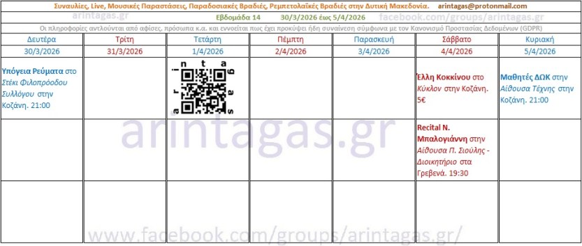 Υπόγεια Ρεύματα στο Στέκι Φιλοπρόοδου Συλλόγου στην Κοζάνη. Δευτέρα 30/3/26, 21:00Έλλη Κοκκίνου στο Κύκλον στην Κοζάνη. Σάββατο 4/4/26, 5€Recital Ν. Μπαλογιάννη στην Αίθουσα Π. Σιούλης – Διοικητήριο στα Γρεβενά. Σάββατο 4/4/26, 19:30Μαθητές ΔΩΚ στην Αίθουσα Τέχνης στην Κοζάνη. Κυριακή 5/4/26, 21:00