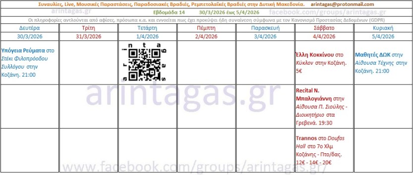 Υπόγεια Ρεύματα στο Στέκι Φιλοπρόοδου Συλλόγου στην Κοζάνη. Δευτέρα 30/3/26, 21:00Έλλη Κοκκίνου στο Κύκλον στην Κοζάνη. Σάββατο 4/4/26, 5€Recital Ν. Μπαλογιάννη στην Αίθουσα Π. Σιούλης – Διοικητήριο στα Γρεβενά. Σάββατο 4/4/26, 19:30Trannos στο Doufas Hall στο 7ο Χλμ Κοζάνης – Πτο/δας. Σάββατο 4/4/26, 12€ – 14€ – 20€Μαθητές ΔΩΚ στην Αίθουσα Τέχνης στην Κοζάνη. Κυριακή 5/4/26, 21:00