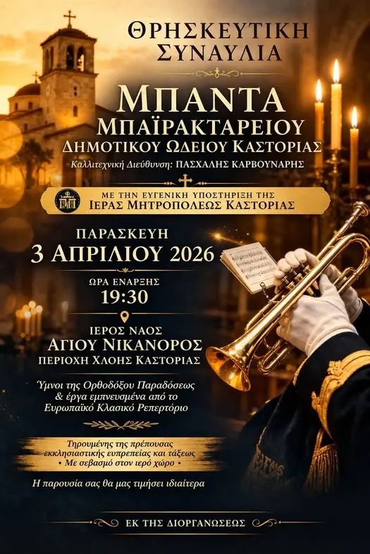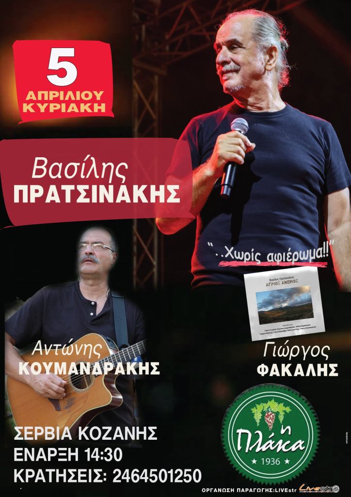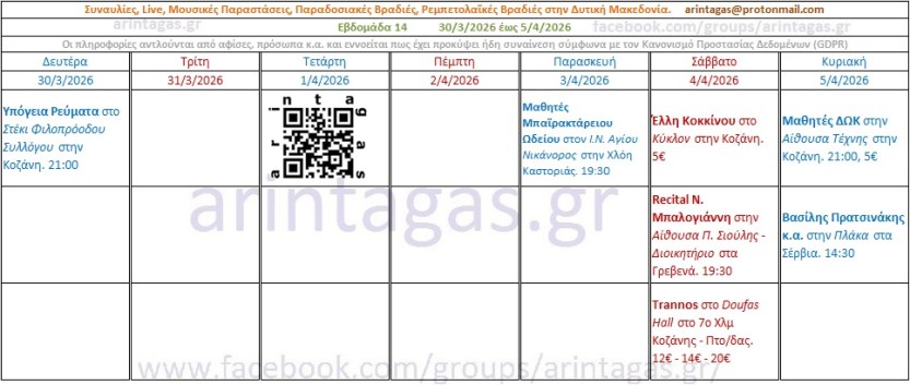 Υπόγεια Ρεύματα στο Στέκι Φιλοπρόοδου Συλλόγου στην Κοζάνη. Δευτέρα 30/3/26, 21:00Μαθητές Μπαϊρακτάρειου Ωδείου στον Ι.Ν. Αγίου Νικάνορος στην Χλόη Καστοριάς. Παρασκευή 3/4/26, 19:30Έλλη Κοκκίνου στο Κύκλον στην Κοζάνη. Σάββατο 4/4/26, 5€Recital Ν. Μπαλογιάννη στην Αίθουσα Π. Σιούλης – Διοικητήριο στα Γρεβενά. Σάββατο 4/4/26, 19:30Trannos στο Doufas Hall στο 7ο Χλμ Κοζάνης – Πτο/δας. Σάββατο 4/4/26, 12€ – 14€ – 20€Μαθητές ΔΩΚ στην Αίθουσα Τέχνης στην Κοζάνη. Κυριακή 5/4/26, 21:00, 5€Βασίλης Πρατσινάκης κ.α. στην Πλάκα στα Σέρβια. Κυριακή 5/4/26, 14:30