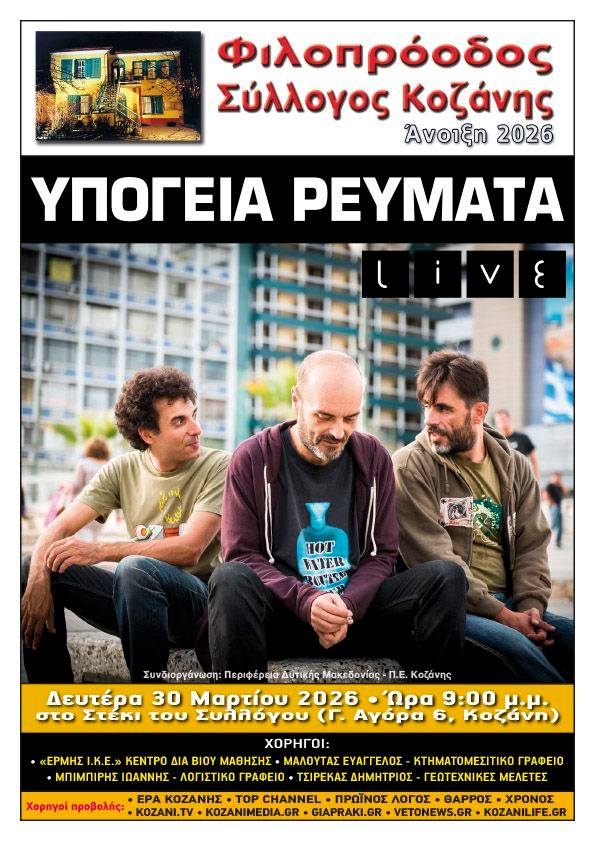 Υπόγεια Ρεύματα στο Στέκι Φιλοπρόοδου Συλλόγου στην Κοζάνη. Δευτέρα 30/3/26, 21:00Μαθητές Μπαϊρακτάρειου Ωδείου στον Ι.Ν. Αγίου Νικάνορος στην Χλόη Καστοριάς. Παρασκευή 3/4/26, 19:30Έλλη Κοκκίνου στο Κύκλον στην Κοζάνη. Σάββατο 4/4/26, 5€Recital Ν. Μπαλογιάννη στην Αίθουσα Π. Σιούλης – Διοικητήριο στα Γρεβενά. Σάββατο 4/4/26, 19:30Trannos στο Doufas Hall στο 7ο Χλμ Κοζάνης – Πτο/δας. Σάββατο 4/4/26, 12€ – 14€ – 20€Μαθητές ΔΩΚ στην Αίθουσα Τέχνης στην Κοζάνη. Κυριακή 5/4/26, 21:00, 5€Βασίλης Πρατσινάκης κ.α. στην Πλάκα στα Σέρβια. Κυριακή 5/4/26, 14:30