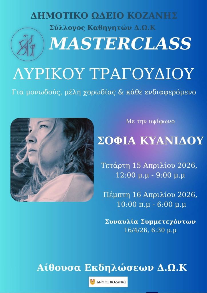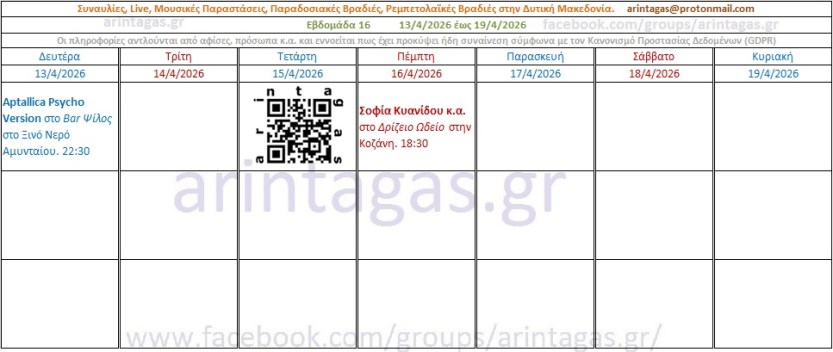 Aptallica Psycho Version στο Bar Ψίλος στο Ξινό Νερό Αμυνταίου. Δευτέρα 13/4/26, 22:30Σοφία Κυανίδου κ.α. στο Δρίζειο Ωδείο στην Κοζάνη. Πέμπτη 16/4/26, 18:30