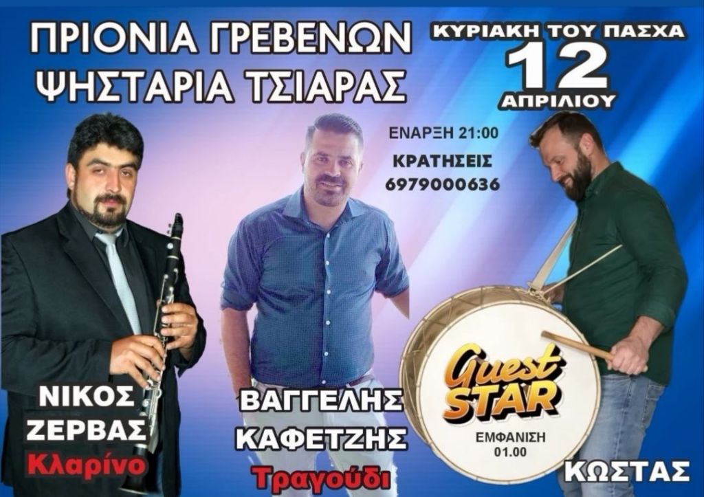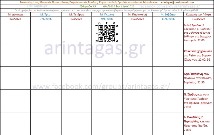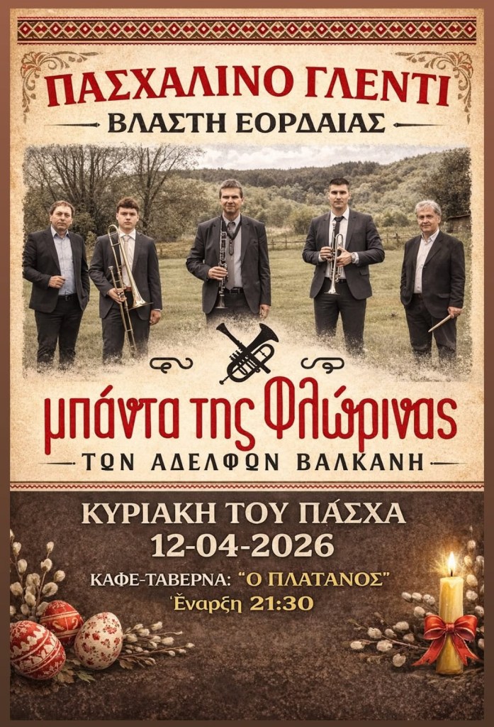 Λαϊκή Βραδιά (Δ. Βούβαλης, Β. Γκάλγκος) στο Φιλοπροοδευτικό Σύλλογο στο Επταχώρι Καστοριάς. Κυριακή 12/4/26, 22:00Χάλκινα Ηχοχρώματα στο Retro στο Βαρικό Φλώρινας. Κυριακή 12/4/26, 22:00, 5€Αφοί Βαλκάνη στον Πλάτανο στην Βλάστη Εορδαίας. Κυριακή 12/4/26, 21:30Ν. Ζέρβας κ.α. στην Ψησταριά Τσιάρας στα Πριόνια Γρεβενών. Κυριακή 12/4/26, 21:00Δ. Παυλίδης, Γ. Περπερίδης κ.α. στο Floka στην Πτο/δα. Κυριακή 12/4/26, 21:30