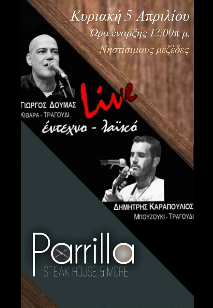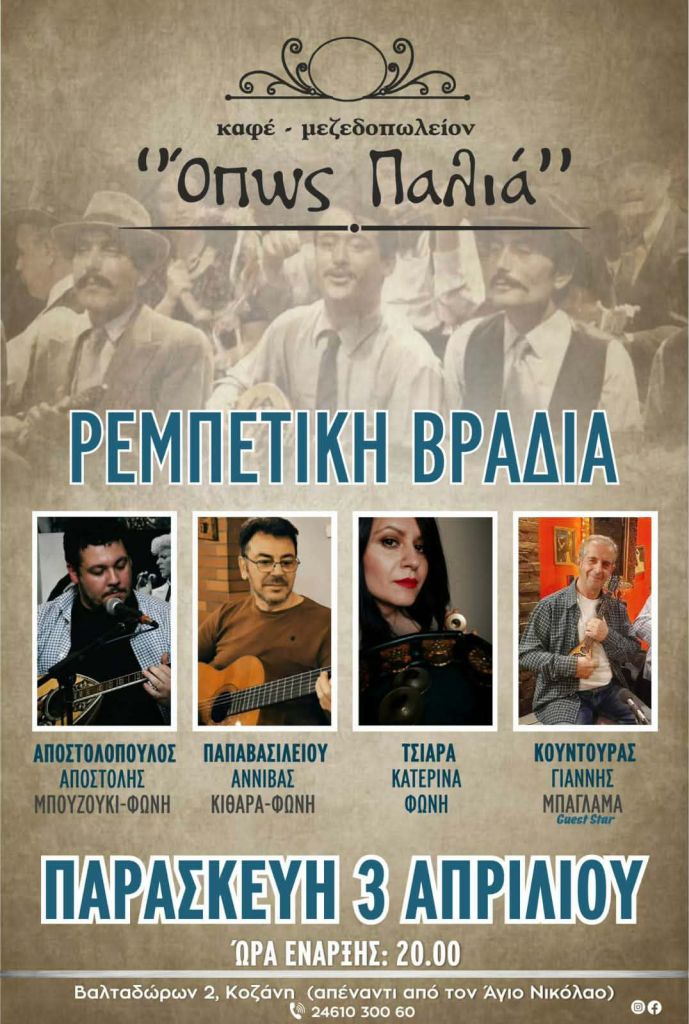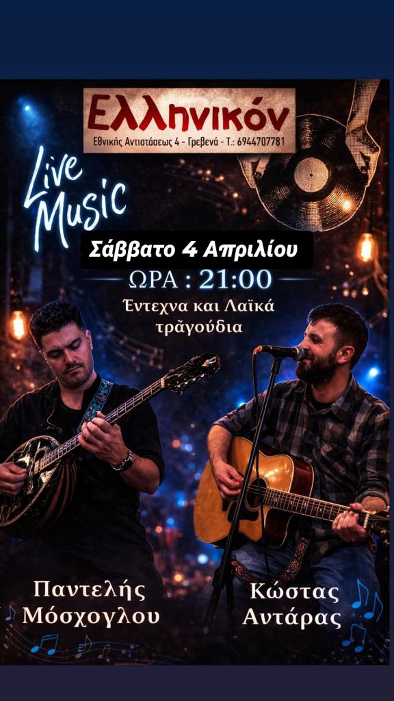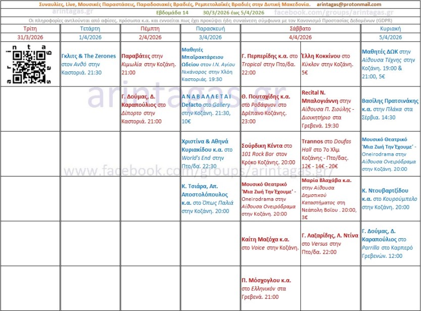 Μαθητές Μπαϊρακτάρειου Ωδείου στον Ι.Ν. Αγίου Νικάνορος στην Χλόη Καστοριάς. Παρασκευή 3/4/26, 19:30Α Ν Α Β Α Λ Λ Ε Τ Α Ι Defacto στο Gallery στην Κοζάνη. Παρασκευή 3/4/26, 21:30, 10€Χριστίνα & Αθηνά Κυριακίδου κ.α. στο World’s End στην Πτο/δα. Παρασκευή 3/4/26, 22:30Κ. Τσιάρα, Απ. Αποστολόπουλος κ.α. στο Όπως Παλιά στην Κοζάνη. Παρασκευή 3/4/26, 20:00Έλλη Κοκκίνου στο Κύκλον στην Κοζάνη. Σάββατο 4/4/26, 5€Recital Ν. Μπαλογιάννη στην Αίθουσα Π. Σιούλης – Διοικητήριο στα Γρεβενά. Σάββατο 4/4/26, 19:30Trannos στο Doufas Hall στο 7ο Χλμ Κοζάνης – Πτο/δας. Σάββατο 4/4/26, 12€ – 14€ – 20€Μαρία Βλαχάβα κ.α. στην Αίθουσα Δημοτικού Καταστήματος στη Νεάπολη Βοΐου . Σάββατο 4/4/26, 20:00, 3€Γ. Περπερίδης κ.α. στο Tropical στην Πτο/δα. Σάββατο 4/4/26, 22:00Θ. Πουταχίδης κ.α. στο Ροδάφνον στο Δρέπανο Κοζάνης. Σάββατο 4/4/26, 23:00Σούρδικη Κέντα στο 101 Rock Bar στον Κρόκο Κοζάνης. Σάββατο 4/4/26, 20:00Καίτη Μαζόχα κ.α. στο Voice στην Κοζάνη. Σάββατο 4/4/26.Γ. Λαζαρίδης, Λ. Ντίνα στο Versus στην Πτο/δα. Σάββατο 4/4/26. 22:00Π. Μόσχογλου κ.α. στο Ελληνικόν στα Γρεβενά. Σάββατο 4/4/26. 21:00Μουσικό Θεατρικό ‘Μια Ζωή Την Έχουμε’ – Oneirodrama στην Αίθουσα Ονειρόδραμα στην Κοζάνη. Σάββατο 4/4/26 & Κυριακή 5/4/26, 20:00Μαθητές ΔΩΚ στην Αίθουσα Τέχνης στην Κοζάνη. Κυριακή 5/4/26, 19:00 & 21:00, 5€Βασίλης Πρατσινάκης κ.α. στην Πλάκα στα Σέρβια. Κυριακή 5/4/26, 14:30Κ. Ντουβαρτζίδου κ.α. στο Κουρούμπελο στην Κοζάνη. Κυριακή 5/4/26, 20:00Γ. Δούμας, Δ. Καραπούλιος στο Parrilla στο Καρπερό Γρεβενών. Κυριακή 5/4/26, 12:00