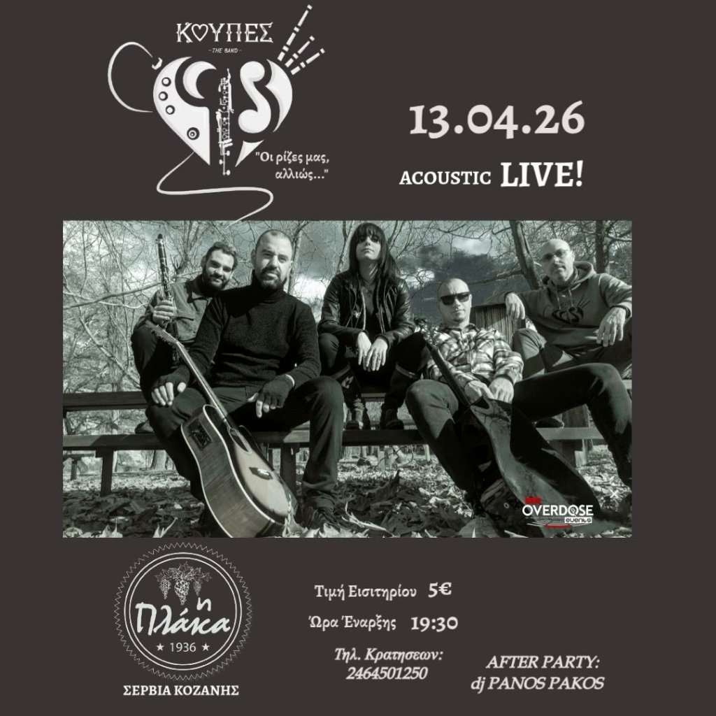 Aptallica Psycho Version στο Bar Ψίλος στο Ξινό Νερό Αμυνταίου. Δευτέρα 13/4/26, 22:30Κούπες Acoustic στην Πλάκα στα Σέρβια Κοζάνης. Δευτέρα 13/4/26, 19:30, 5€Σοφία Κυανίδου κ.α. στο Δρίζειο Ωδείο στην Κοζάνη. Πέμπτη 16/4/26, 18:30