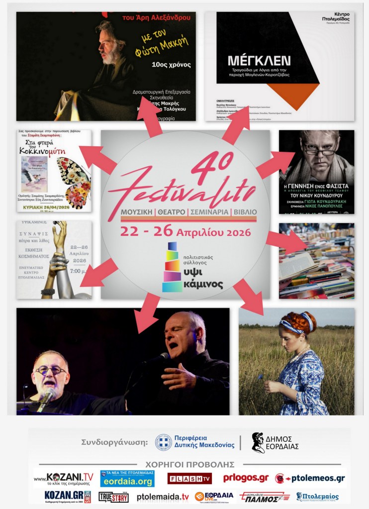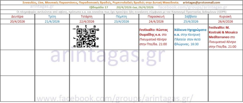 -Παρασκευή 24/4/26, Συναυλία Αφιέρωμα στον Θάνο Μικρούτσικο – με τον Κώστα Θωμαΐδη, Πνευματικό Κέντρο, Πτολεμαΐδα. 21:00 -Κυριακή 26/4/26, Maria Kostraki – Mosaico Mediterraneo, Πνευματικό Κέντρο, Πτολεμαΐδα. 21:00 *Πηγή: fb ΥψικάμινοςΧάλκινα Ηχοχρώματα κ.α. στην Κεντρική Πλατεία στον Αετό Φλώρινας. Σάββατο 25/4/26, 16:30