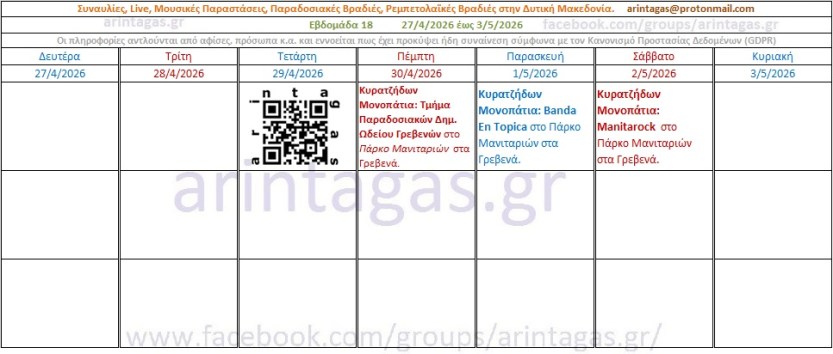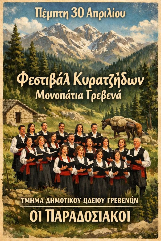 -Κυρατζήδων Μονοπάτια: Τμήμα Παραδοσιακών Δημ. Ωδείου Γρεβενών στο Πάρκο Μανιταριών στα Γρεβενά. Πέμπτη 30/4/26 -Κυρατζήδων Μονοπάτια: Banda En Topica στο Πάρκο Μανιταριών στα Γρεβενά. Παρασκευή 1/5/26 -Κυρατζήδων Μονοπάτια: Manitarock στο Πάρκο Μανιταριών στα Γρεβενά. Σάββατο 2/5/26