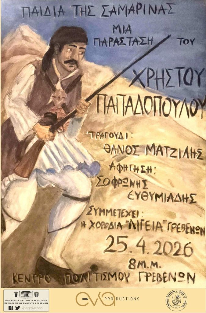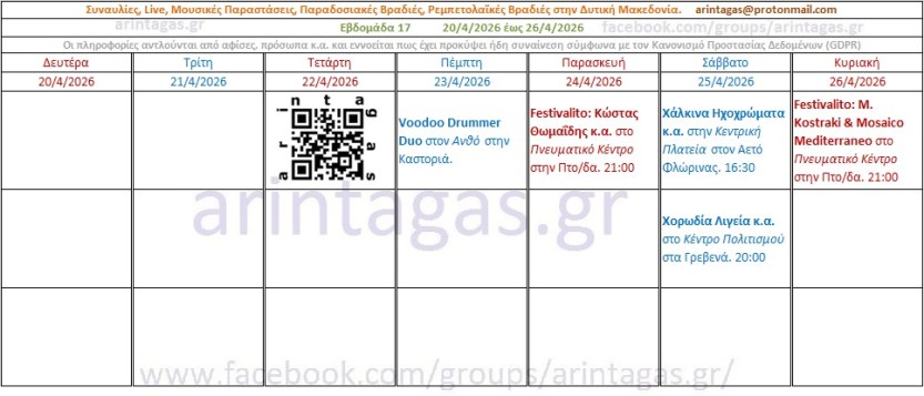 Voodoo Drummer Duo στον Ανθό στην Καστοριά. Πέμπτη 23/4/26.-Παρασκευή 24/4/26, Συναυλία Αφιέρωμα στον Θάνο Μικρούτσικο – με τον Κώστα Θωμαΐδη, Πνευματικό Κέντρο, Πτολεμαΐδα. 21:00 -Κυριακή 26/4/26, Maria Kostraki – Mosaico Mediterraneo, Πνευματικό Κέντρο, Πτολεμαΐδα. 21:00 *Πηγή: fb ΥψικάμινοςΧάλκινα Ηχοχρώματα κ.α. στην Κεντρική Πλατεία στον Αετό Φλώρινας. Σάββατο 25/4/26, 16:30Χορωδία Λιγεία κ.α. στο Κέντρο Πολιτισμού στα Γρεβενά. Σάββατο 25/4/26, 20:00