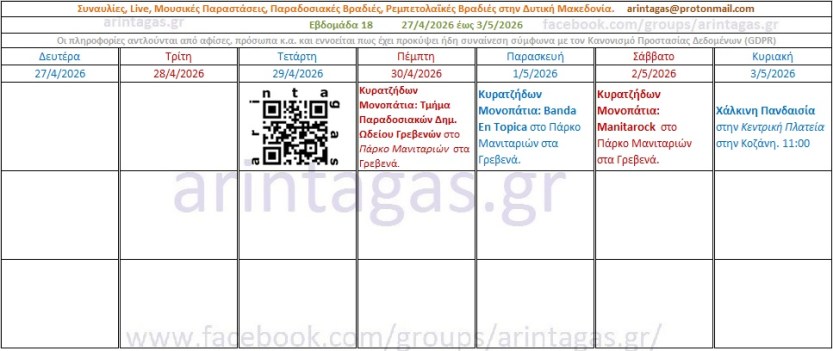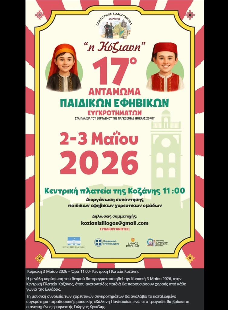 -Κυρατζήδων Μονοπάτια: Τμήμα Παραδοσιακών Δημ. Ωδείου Γρεβενών στο Πάρκο Μανιταριών στα Γρεβενά. Πέμπτη 30/4/26 -Κυρατζήδων Μονοπάτια: Banda En Topica στο Πάρκο Μανιταριών στα Γρεβενά. Παρασκευή 1/5/26 -Κυρατζήδων Μονοπάτια: Manitarock στο Πάρκο Μανιταριών στα Γρεβενά. Σάββατο 2/5/26Χάλκινη Πανδαισία στην Κεντρική Πλατεία στην Κοζάνη. Κυριακή 3/5/26. 11:00
