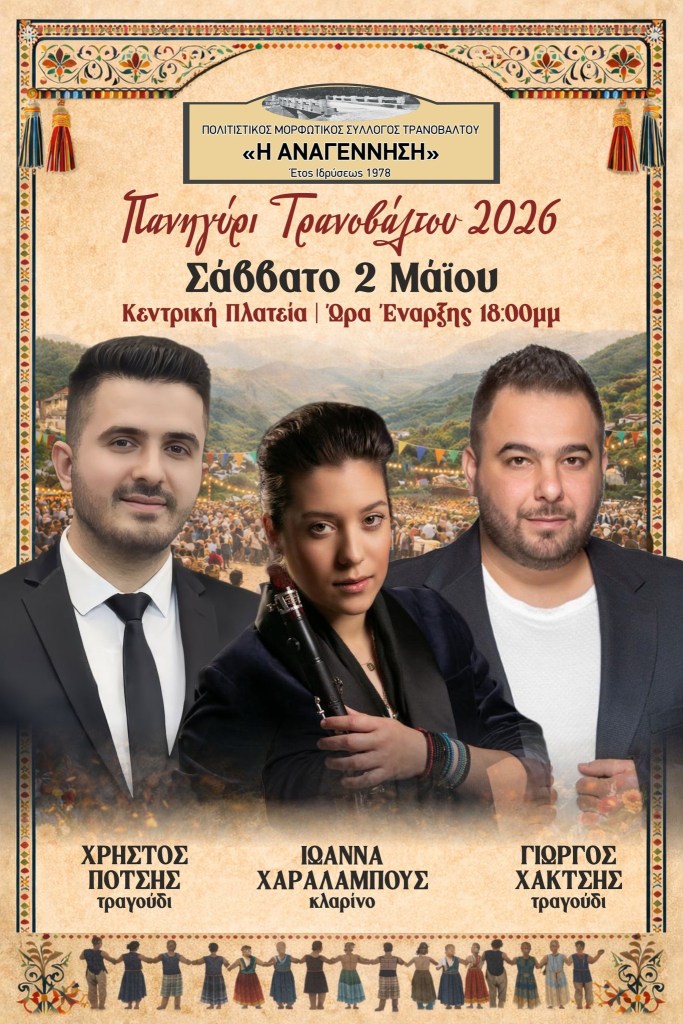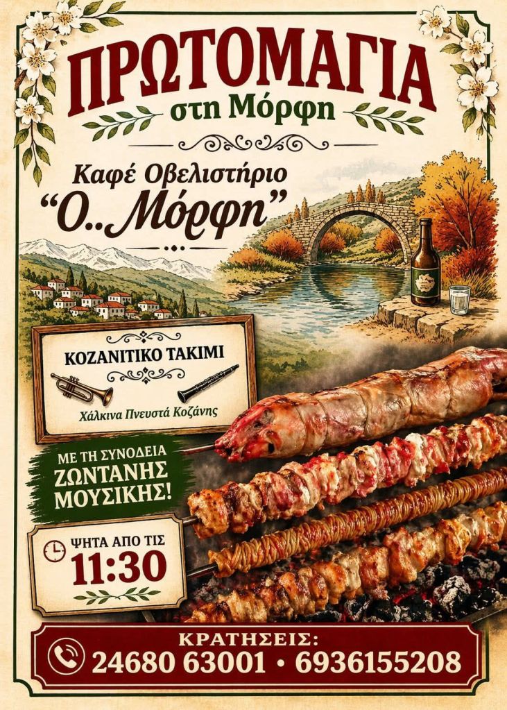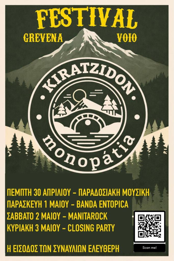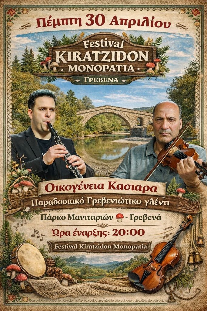 -Κυρατζήδων Μονοπάτια: Τμήμα Παραδοσιακών Δημ. Ωδείου Γρεβενών στο Πάρκο Μανιταριών στα Γρεβενά. Πέμπτη 30/4/26, 20:00 -Κυρατζήδων Μονοπάτια: Banda En Topica, Χαόνια στο Πάρκο Μανιταριών στα Γρεβενά. Παρασκευή 1/5/26, 20:00 -Κυρατζήδων Μονοπάτια: Manitarock στο Πάρκο Μανιταριών στα Γρεβενά. Σάββατο 2/5/26, 21:00 *Πηγή: fb event ‘ΦΕΣΤΙΒΑΛ ΚΥΡΑΤΖΉΔΩΝ ΜΟΝΟΠΑΤΙΑ’ Κοζανίτικο Τακίμι στο Καφέ Μόρφη στην Μόρφη Βοΐου. Παρασκευή 1/5/26, 11:30Χρ. Πότσης, Ι. Χαραλάμπους κ.α. στην Πλατεία στο Τρανόβαλτο Σερβίων. Σάββατο 2/5/26, 18:00Χάλκινη Πανδαισία στην Κεντρική Πλατεία στην Κοζάνη. Κυριακή 3/5/26. 11:00