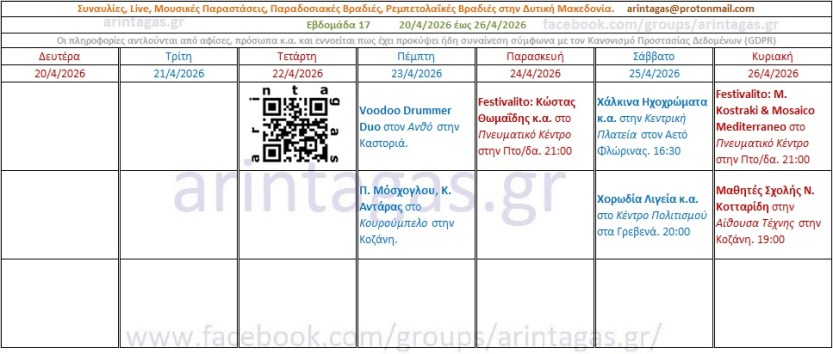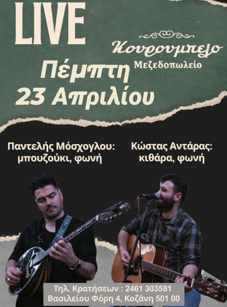 Voodoo Drummer Duo στον Ανθό στην Καστοριά. Πέμπτη 23/4/26.Π. Μόσχογλου, Κ. Αντάρας στο Κουρούμπελο στην Κοζάνη. Πέμπτη 23/4/26.-Παρασκευή 24/4/26, Συναυλία Αφιέρωμα στον Θάνο Μικρούτσικο – με τον Κώστα Θωμαΐδη, Πνευματικό Κέντρο, Πτολεμαΐδα. 21:00 -Κυριακή 26/4/26, Maria Kostraki – Mosaico Mediterraneo, Πνευματικό Κέντρο, Πτολεμαΐδα. 21:00 *Πηγή: fb ΥψικάμινοςΧάλκινα Ηχοχρώματα κ.α. στην Κεντρική Πλατεία στον Αετό Φλώρινας. Σάββατο 25/4/26, 16:30Χορωδία Λιγεία κ.α. στο Κέντρο Πολιτισμού στα Γρεβενά. Σάββατο 25/4/26, 20:00Μαθητές Σχολής Ν. Κοτταρίδη στην Αίθουσα Τέχνης στην Κοζάνη. Σάββατο 25/4/26, 19:00
