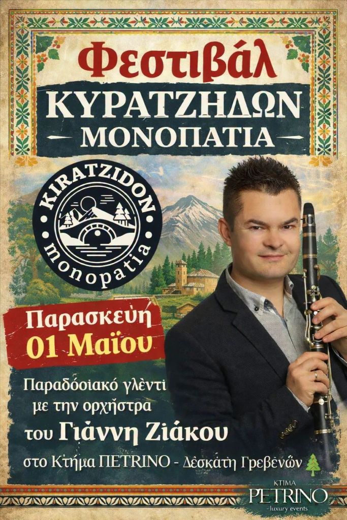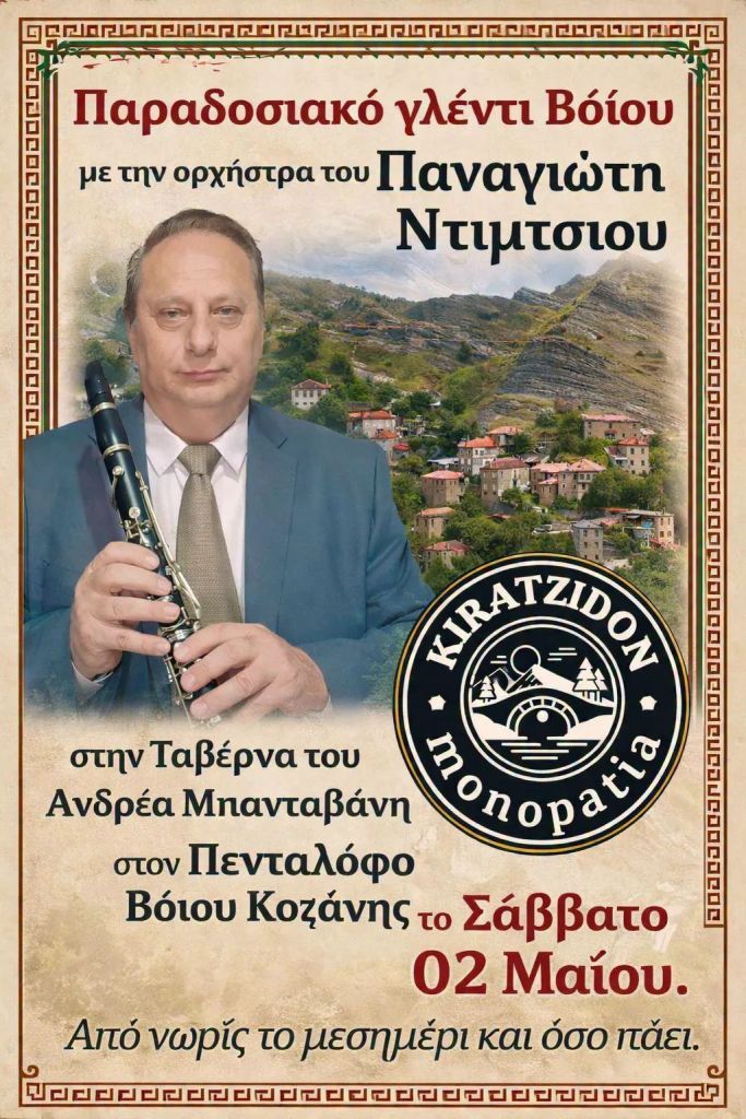 -Κυρατζήδων Μονοπάτια: Τμήμα Παραδοσιακών Δημ. Ωδείου Γρεβενών στο Πάρκο Μανιταριών στα Γρεβενά. Πέμπτη 30/4/26, 20:00 -Κυρατζήδων Μονοπάτια: Banda En Topica, Χαόνια στο Πάρκο Μανιταριών στα Γρεβενά. Παρασκευή 1/5/26, 20:00 -Κυρατζήδων Μονοπάτια: Manitarock στο Πάρκο Μανιταριών στα Γρεβενά. Σάββατο 2/5/26, 21:00 *Πηγή: fb event ‘ΦΕΣΤΙΒΑΛ ΚΥΡΑΤΖΉΔΩΝ ΜΟΝΟΠΑΤΙΑ’ Κοζανίτικο Τακίμι στο Καφέ Μόρφη στην Μόρφη Βοΐου. Παρασκευή 1/5/26, 11:30Ορχήστρα Χ. Ζιάκου στο Πέτρινο στην Δεσκάτη Γρεβενών. Παρασκευή 1/5/26. Χρ. Πότσης, Ι. Χαραλάμπους κ.α. στην Πλατεία στο Τρανόβαλτο Σερβίων. Σάββατο 2/5/26, 18:00Ορχήστρα Π. Ντίμτσιου στην Ταβέρνα Μπανταβάνη στον Πεντάλοφο Βοΐου. Σάββατο 2/5/26, ΜεσημέριΧάλκινη Πανδαισία στην Κεντρική Πλατεία στην Κοζάνη. Κυριακή 3/5/26. 11:00