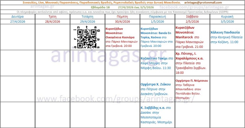 -Κυρατζήδων Μονοπάτια: Τμήμα Παραδοσιακών Δημ. Ωδείου Γρεβενών στο Πάρκο Μανιταριών στα Γρεβενά. Πέμπτη 30/4/26, 20:00 -Κυρατζήδων Μονοπάτια: Banda En Topica, Χαόνια στο Πάρκο Μανιταριών στα Γρεβενά. Παρασκευή 1/5/26, 20:00 -Κυρατζήδων Μονοπάτια: Manitarock στο Πάρκο Μανιταριών στα Γρεβενά. Σάββατο 2/5/26, 21:00 *Πηγή: fb event ‘ΦΕΣΤΙΒΑΛ ΚΥΡΑΤΖΉΔΩΝ ΜΟΝΟΠΑΤΙΑ’ Κοζανίτικο Τακίμι στο Καφέ Μόρφη στην Μόρφη Βοΐου. Παρασκευή 1/5/26, 11:30Ορχήστρα Χ. Ζιάκου στο Πέτρινο στην Δεσκάτη Γρεβενών. Παρασκευή 1/5/26. K. Σαββίδης κ.α. στο Δασάκι στην Μεσοποταμία Καστοριάς. Παρασκευή 1/5/26. ΜεσημέριΧρ. Πότσης, Ι. Χαραλάμπους κ.α. στην Πλατεία στο Τρανόβαλτο Σερβίων. Σάββατο 2/5/26, 18:00Ορχήστρα Π. Ντίμτσιου στην Ταβέρνα Μπανταβάνη στον Πεντάλοφο Βοΐου. Σάββατο 2/5/26, ΜεσημέριΧάλκινη Πανδαισία στην Κεντρική Πλατεία στην Κοζάνη. Κυριακή 3/5/26. 11:00