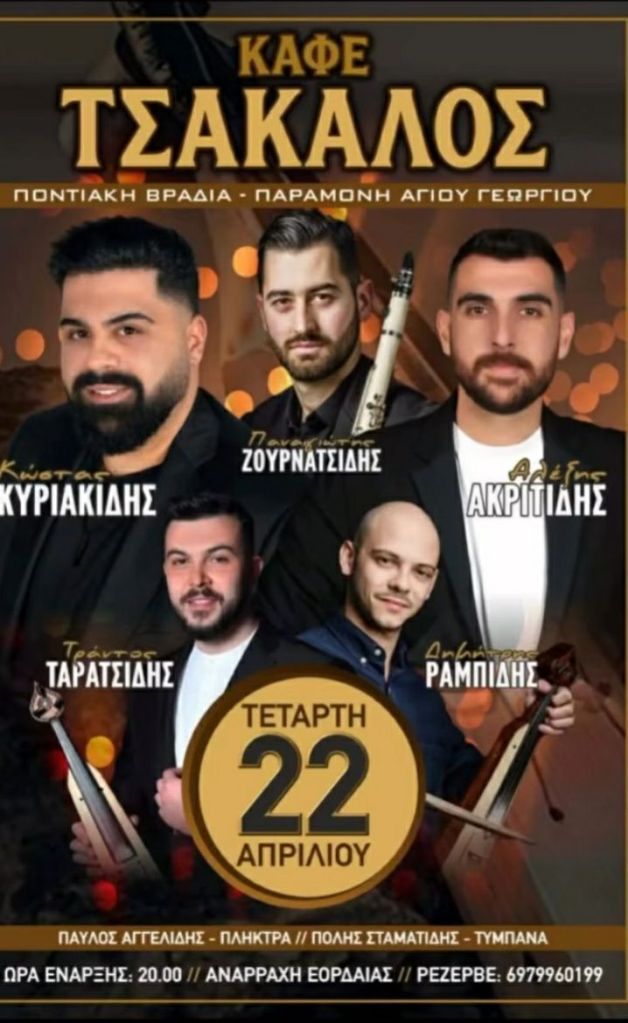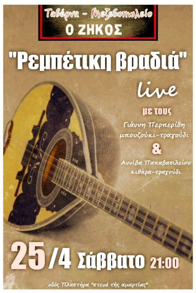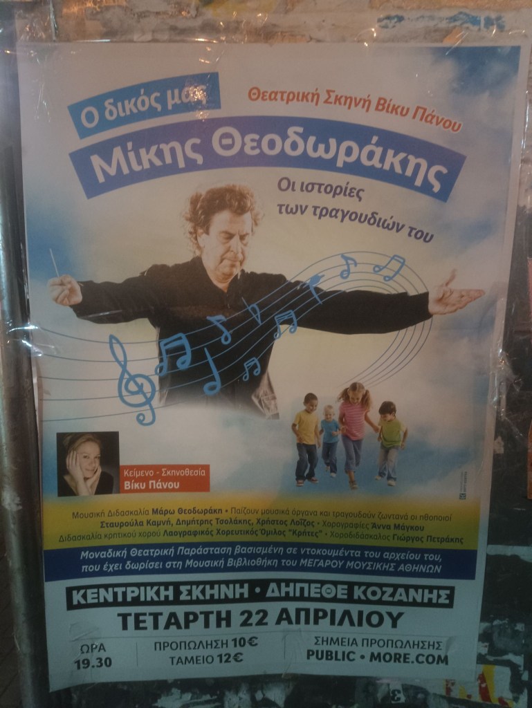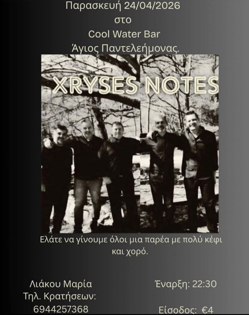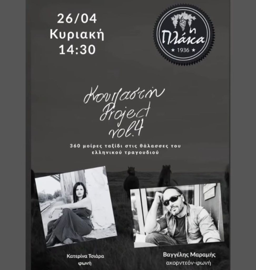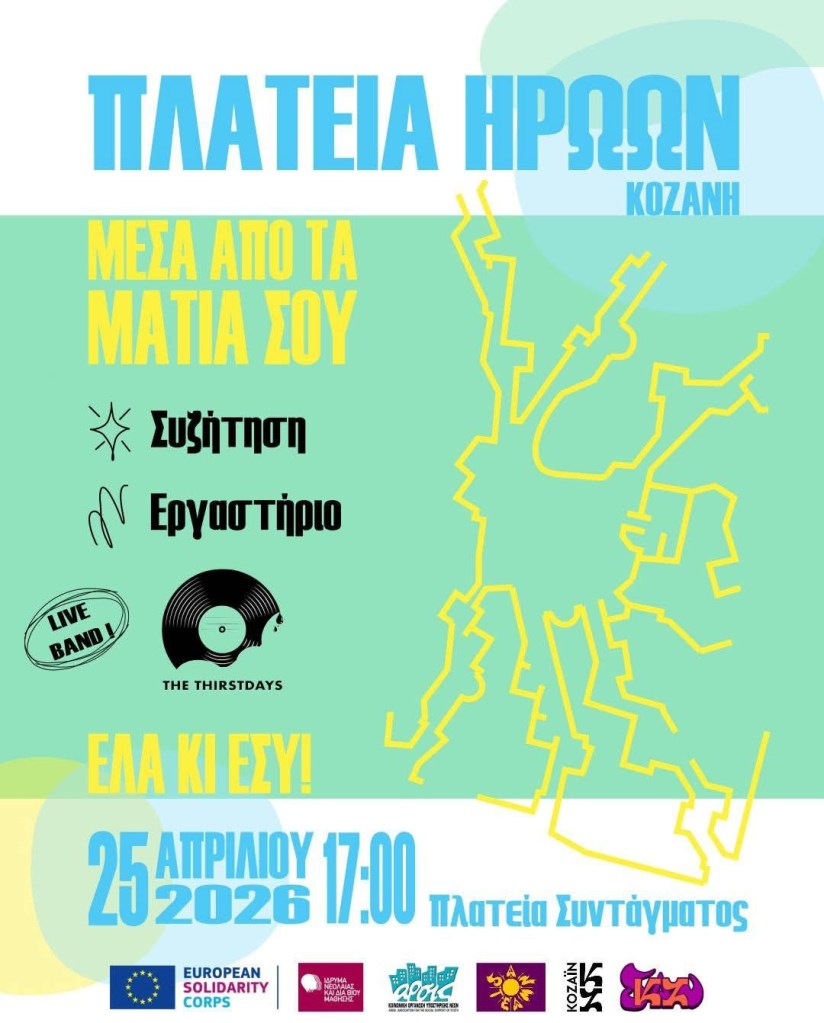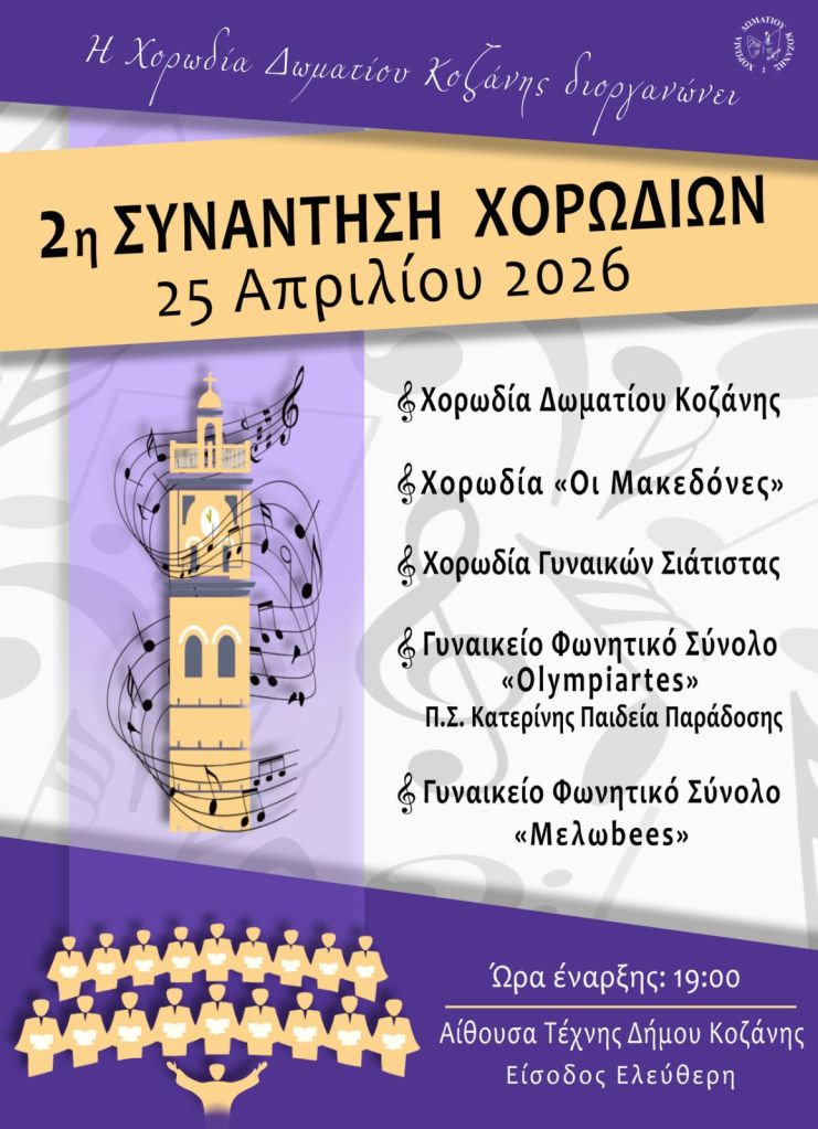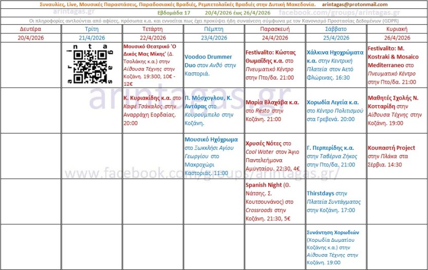 Μουσικό Θεατρικό ‘Ο Δικός Μας Μίκης’ (Δ. Τσολάκης κ.α.) στην Αίθουσα Τέχνης στην Κοζάνη. Τετάρτη 22/4/26, 19:300, 10€ – 12€Κ. Κυριακίδης κ.α. στο Καφέ Τσάκαλος στην Αναρράχη Εορδαίας. Τετάρτη 22/4/26, 20:00Voodoo Drummer Duo στον Ανθό στην Καστοριά. Πέμπτη 23/4/26.Π. Μόσχογλου, Κ. Αντάρας στο Κουρούμπελο στην Κοζάνη. Πέμπτη 23/4/26.Μουσικό Ηχόχρωμα στο Ξωκκλήσι Αγίου Γεωργίου στο Μακροχώρι Καστοριάς. Πέμπτη 23/4/26. 11:00-Παρασκευή 24/4/26, Συναυλία Αφιέρωμα στον Θάνο Μικρούτσικο – με τον Κώστα Θωμαΐδη, Πνευματικό Κέντρο, Πτολεμαΐδα. 21:00 -Κυριακή 26/4/26, Maria Kostraki – Mosaico Mediterraneo, Πνευματικό Κέντρο, Πτολεμαΐδα. 21:00 *Πηγή: fb ΥψικάμινοςSpanish Night (Θ. Νάτσης. Σ. Κουτσουνάνος) στο Crossroads στην Κοζάνη. Παρασκευή 24/4/26, 21:30, 5€Χρυσές Νότες στο Cool Water στον Άγιο Παντελεήμονα Αμυνταίου. Παρασκευή 24/4/26, 22:30, 4€Μαρία Βλαχάβα κ.α. στο Resto στην Κοζάνη. Παρασκευή 24/4/26, 21:00Χάλκινα Ηχοχρώματα κ.α. στην Κεντρική Πλατεία στον Αετό Φλώρινας. Σάββατο 25/4/26, 16:30Χορωδία Λιγεία κ.α. στο Κέντρο Πολιτισμού στα Γρεβενά. Σάββατο 25/4/26, 20:00Γ. Περπερίδης κ.α. στην Ταβέρνα Ζήκος στην Πτο/δα. Σάββατο 25/4/26, 21:00Συνάντηση Χορωδιών (Χορωδία Δωματίου Κοζάνης κ.α.) στην Αίθουσα Τέχνης στην Κοζάνη. Σάββατο 25/4/26, 19:00Thirstdays στην Πλατεία Συντάγματος στην Κοζάνη. Σάββατο 25/4/26, 17:00Μαθητές Σχολής Ν. Κοτταρίδη στην Αίθουσα Τέχνης στην Κοζάνη. Κυριακή 26/4/26, 19:00Κουπαστή Project στην Πλάκα στα Σέρβια. Κυριακή 26/4/26, 14:30